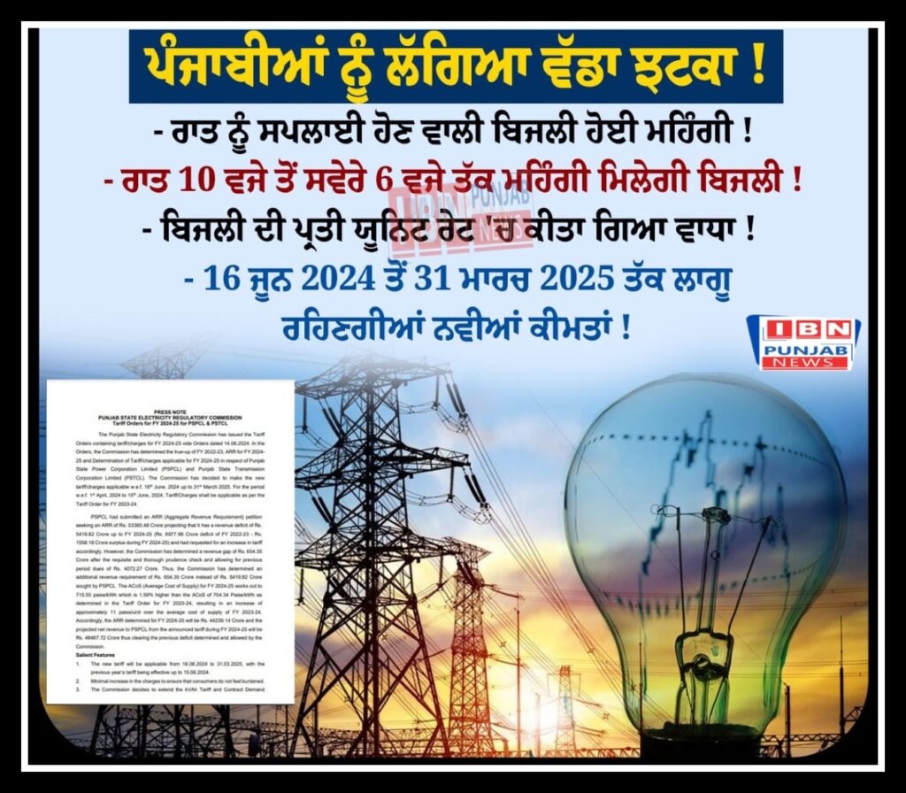 ਰਾਤ ਨੂੰ ਸਪਲਾਈ ਹੋਣ ਵਾਲੀ ਬਿਜਲੀ ਹੋਈ ਮਹਿੰਗੀ ਰਾਤ 10 ਵਜੇ ਤੋਂ ਸਵੇਰੇ 6 ਵਜੇ ਤੱਕ ਮਹਿੰਗੀ ਮਿਲੇਗੀ ਬਿਜਲੀ