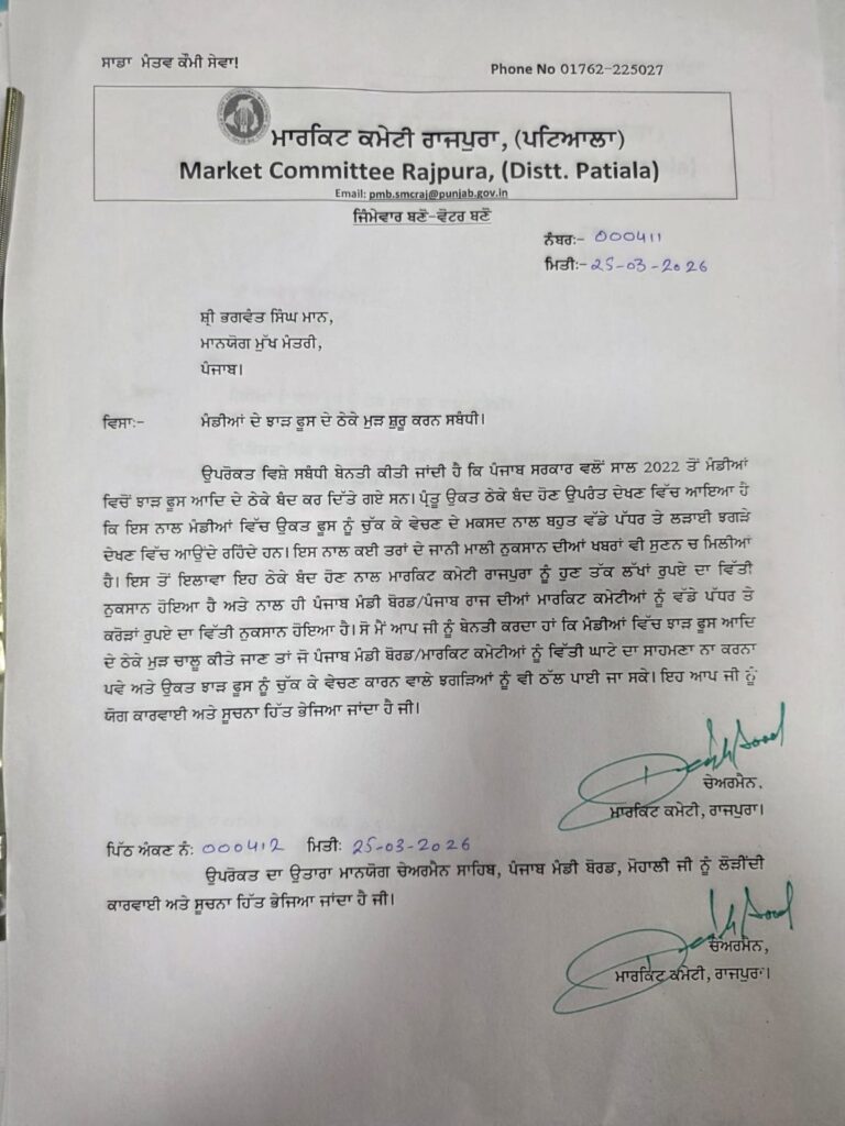 Rajpura, March 26 (Himanshu Harry): Chairman of Market Committee Rajpura of Punjab Mandi Board, Deepak Sood has written a letter to the Chief Minister of Punjab regarding the contracts for the stubble of Rajpura Grain Market. On this occasion, in the letter number 000411/25/03/26 written by Chairman Market Committee, Rajpura Deepak Sood to the Chief Minister of Punjab, it has been written that after the formation of the AAP government in Punjab, the contracts for stubble were stopped, but after the contracts were closed, there are large-scale fights due to the issue of picking up stubble and selling it, due to which many types of loss of life and property have also been heard. He has written that due to the closure of these contracts, the Market Committee Rajpura has also suffered a financial loss of lakhs of rupees so far. Chairman Sood has requested Chief Minister Bhagwant Singh Mann through a letter that the straw auctions should be restarted in Rajpura Mandi as well as in the mandis of the entire Punjab so that the market committee can get economic benefits and the conflicts that may arise can be avoided. It is worth mentioning that due to the closure of straw auctions, there are conflicts between different groups in the mandi every season regarding the harvesting of straw and there is also a fight between different groups.