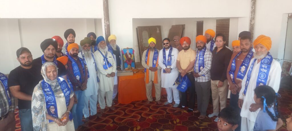 Rajpura, April 15 (Himanshu Harry): The birth anniversary of Dr. Bhim Rao Ambedkar Ji was celebrated with great pomp and show at the Dharamshala of Khanpur Gandian village near here by Bhagat Shri Guru Ravidas Committee under the leadership of Gurnam Singh, executive member of Jai Bhim Manch. In which, Jai Bhim Manch President Sukhjinder Sukhi attended as the special chief guest along with his team and was warmly welcomed and thanked by the people gathered on the occasion and after bowing to Baba Saheb, receiving his blessings, laddus were distributed. On this occasion, President Sukhjinder Sukhi shed light on the lifestyle of Baba Saheb and told about his guidance and conduct. On this occasion, President Sukhjinder Sukhi also made people aware about the signature campaign run by Jai Bhim Manch and there was a lot of enthusiasm towards Baba Saheb from the people gathered there who love and respect Baba Saheb very much. Meanwhile, the elders, mothers and children of the village present on the occasion also gave their full support by signing and asked that the name of Rajpura ITI Chowk be changed to Ambedkar Chowk. On this occasion, Gursewak Singh Happy, President Guru Ravidas Committee, Joga Singh, Gurpreet Singh, Satnam Singh Babbu, Sukha Dhaliwal, Amreek Singh, General Secretary Gurdarshan Singh, Chief Advisor Vijay Kumar, Santokh Singh Sukha, Naresh Kumar Dr. Soni, Hardeep Singh, Giani Harmesh Singh, Gurbhajan Singh, Hardeep Singh etc. Hundreds of villagers were present.