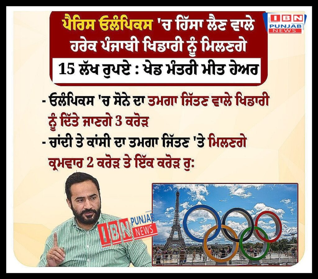ਪੈਰਿਸ ਓਲੰਪਿਕਸ ‘ਚ ਹਿੱਸਾ ਲੈਣ ਵਾਲੇ ਹਰੇਕ ਪੰਜਾਬੀ ਖਿਡਾਰੀ ਨੂੰ ਮਿਲਣਗੇ 15 ਲੱਖ ਰੁਪਏ: ਖੇਡ ਮੰਤਰੀ ਮੀਤ ਹੇਅਰ
