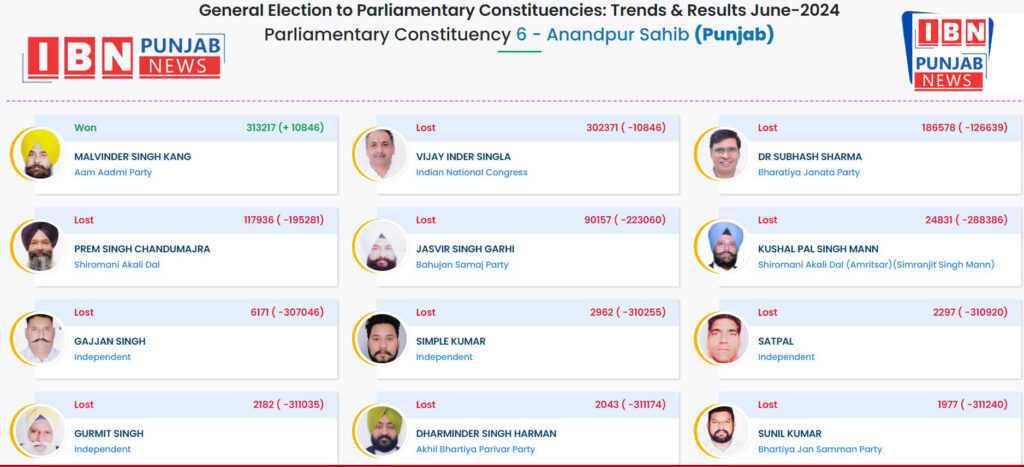 ਅਨੰਦਪੁਰ ਸਾਹਿਬ, 04 ਜੂਨ: ਚੋਣਾਂ ਲੋਕ ਸਭਾ 2024 ਅਨੰਦਪੁਰ ਸਾਹਿਬ ਲੋਕ ਸਭਾ ਸੀਟ ਤੋਂ ਚੋਣ ਲੜ ਰਹੇ ਆਪ ਪਾਰਟੀ ਦੇ ਉਮੀਦਵਾਰ ਮਾਲਵਿੰਦਰ ਸਿੰਘ ਕੰਗ ਨੇ 313217 ਵੋਟਾਂ ਲੈਕੇ 10846 ਵੋਟਾਂ ਦੀ ਲੀਡ ਲੈਕੇ ਜਿੱਤ ਪ੍ਰਾਪਤ ਕੀਤੀ