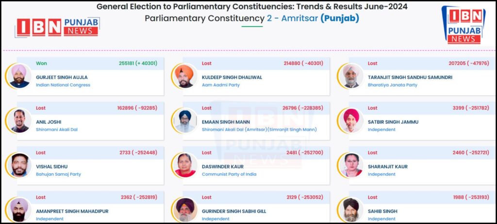 ਚੋਣਾਂ ਲੋਕ ਸਭਾ 2024 ਅੰਮ੍ਰਿਤਸਰ ਲੋਕ ਸਭਾ ਸੀਟ ਤੋਂ ਚੋਣ ਲੜ ਰਹੇ ਕਾਂਗਰਸੀ ਪਾਰਟੀ ਦੇ ਉਮੀਦਵਾਰ ਗੁਰਜੀਤ ਸਿੰਘ ਔਜਲਾ ਨੇ 255181 ਵੋਟਾਂ ਲੈਕੇ 40301 ਵੋਟਾਂ ਦੀ ਲੀਡ ਲੈਕੇ ਜਿੱਤ ਪ੍ਰਾਪਤ ਕੀਤੀ