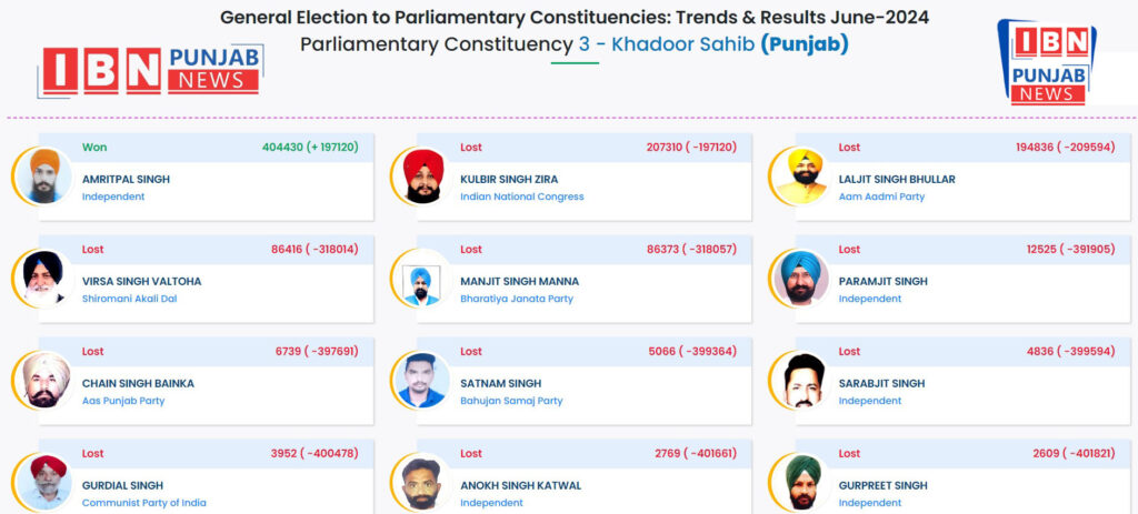 ਖਡੂਰ ਸਾਹਿਬ,04 ਜੂਨ: ਚੋਣਾਂ ਲੋਕ ਸਭਾ 2024 ਖਡੂਰ ਸਾਹਿਬ ਲੋਕ ਸਭਾ ਸੀਟ ਤੋਂ ਚੋਣ ਲੜ ਰਹੇ ਆਜ਼ਾਦ ਉਮੀਦਵਾਰ ਅੰਮ੍ਰਿਤਪਾਲ ਸਿੰਘ ਨੇ 404430 ਵੋਟਾਂ ਹਾਸਲ ਕਰ 197120 ਵੋਟਾਂ ਦੀ ਲੀਡ ਹਾਸਲ ਕਰ ਜਿੱਤ ਪ੍ਰਾਪਤ ਕੀਤੀ