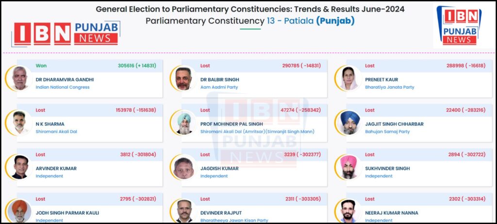 ਪਟਿਆਲਾ,04 ਜੂਨ: ਚੋਣਾਂ ਲੋਕ ਸਭਾ 2024 ਪਟਿਆਲਾ ਲੋਕ ਸਭਾ ਸੀਟ ਤੋਂ ਚੋਣ ਲੜ ਰਹੇ ਕਾਂਗਰਸੀ ਪਾਰਟੀ ਦੇ ਉਮੀਦਵਾਰ ਡਾਕਟਰ ਧਰਮਵੀਰ ਗਾਂਧੀ ਨੇ 305616 ਵੋਟਾਂ ਲੈਕੇ 14831 ਵੋਟਾਂ ਦੀ ਲੀਡ ਲੈਕੇ ਜਿੱਤ ਪ੍ਰਾਪਤ ਕੀਤੀ