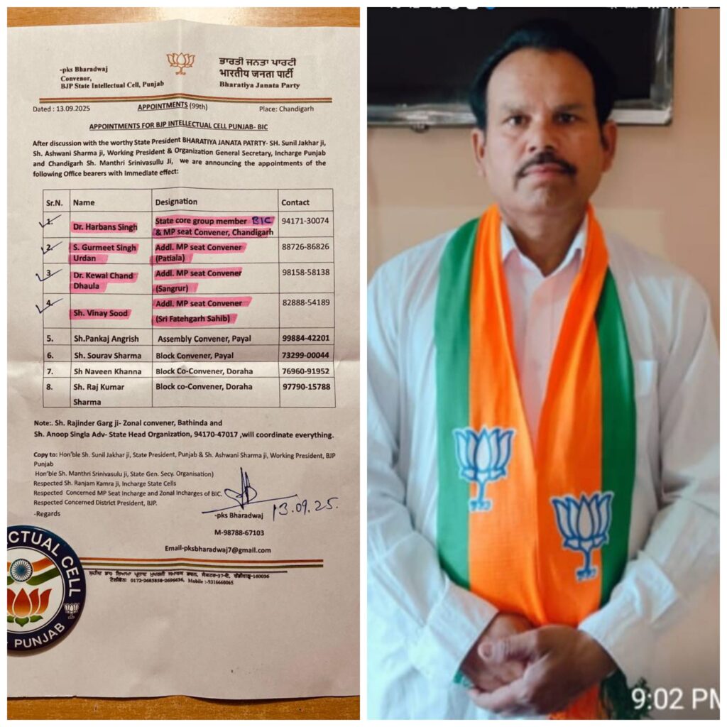 ਪਟਿਆਲਾ/ਰਾਜਪੁਰਾ,15 ਸਤੰਬਰ(ਹਿਮਾਂਸ਼ੂ ਹੈਰੀ):ਹਲਕਾ ਰਾਜਪੁਰਾ ਤੋਂ ਸੀਨੀਅਰ ਭਾਜਪਾ ਆਗੂ ਗੁਰਮੀਤ ਸਿੰਘ ਉੜਦਨ ਨੂੰ ਭਾਜਪਾ ਇੰਟਲੈਕਚੁਅਲ ਸੈਲ ਪੰਜਾਬ ਵੱਲੋਂ ਐਡੀਸ਼ਨਲ ਐਮ.ਪੀ ਸੀਟ ਕਨਵੀਨਰ ਪਟਿਆਲਾ ਨਿਯੁਕਤ ਕੀਤਾ ਗਿਆ। ਇਸ ਮੋੌਕੇ ਭਾਜਪਾ ਆਗੂ ਗੁਰਮੀਤ ਸਿੰਘ ਉੜਦਨ ਨੇ ਐਡੀਸ਼ਨਲ ਐਮ.ਪੀ ਸੀਟ ਕਨਵੀਨਰ ਪਟਿਆਲਾ ਨਿਯੁਕਤ ਕਰਨ ਤੇ ਭਾਜਪਾ ਇੰਟਲੈਕਚੁਅਲ ਸੈਲ ਪੰਜਾਬ ਦੇ ਪ੍ਰਧਾਨ ਪੀ.ਕੇ.ਐਸ ਭਾਰਦਵਾਜ਼ ਦਾ ਧੰਨਵਾਦ ਕਰਦੇ ਕਿਹਾ ਕਿ ਮੈਂ ਪਿਛਲੇ 22 ਸਾਲਾਂ ਤੋਂ ਭਾਰਤੀ ਜਨਤਾ ਪਾਰਟੀ ਦੇ ਨਾਲ ਜੁੜ ਕੇ ਲੋਕਾਂ ਦੀ ਸੇਵਾ ਕਰ ਰਿਹਾ ਹਾਂ ਅਤੇ ਪਹਿਲਾ ਪਾਰਟੀ ਵੱਲੋਂ ਮੈਨੂੰ ਹਲਕਾ ਰਾਜਪੁਰਾ ਤੋਂ ਕਨਵੀਨਰ ਸੀ ਤੇ ਮੈਂ ਹੁਣ ਜਿੱਥੇ ਵੀ ਪਾਰਟੀ ਵੱਲੋ ਮੈਨੂੰ ਜਦ ਵੀ ਮੇਰੀ ਡਿਊਟੀ ਲਗਾਈ ਜਾਵੇਗੀ। ਮੈਂ ਪਟਿਆਲਾ ਜਿਲੇ ਦੇ ਲੋਕਾਂ ਦੀ ਪੂਰੀ ਤਨਦੇਹ ਨਾਲ ਸੇਵਾ ਕਰਾਂਗਾ।