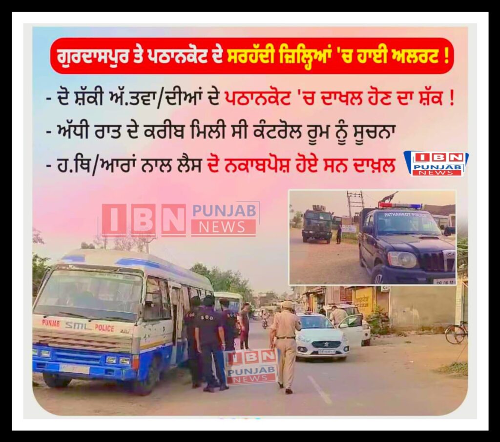 High alert in the border districts of Gurdaspur and Pathankot. The control room was informed that two suspected terrorists had entered Pathankot around midnight.