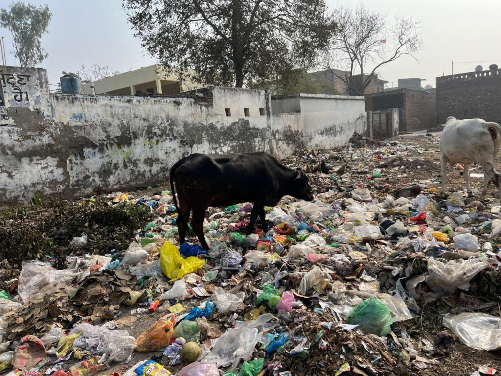 Photo caption: A helpless animal suffocating in an illegal garbage dump near a primary school in Vikas Nagar.