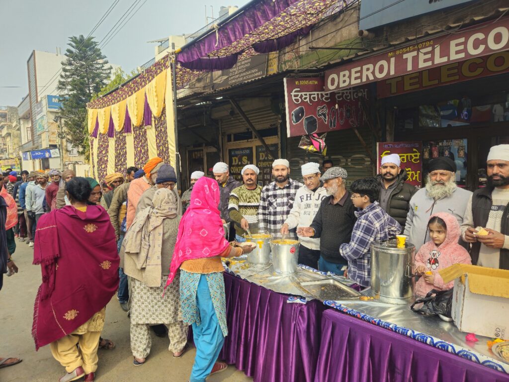 Rajpura, December 26 (Himanshu Harry): At Shri Durga Mandir Road Rajpura, Shri Mahadev Sewa Samiti, with the support of all the shopkeepers of the market, organized a langar dedicated to the unparalleled martyrdom of the younger sons of Dasam Pita Shri Guru Gobind Singh Ji, Baba Zorawar Singh, Baba Fateh Singh and Mata Gujri Ji. On this occasion, the president of the society, Himanshu Harry Setia, said that like every year, this year too, a complete langar of mixed vegetables, tea and biscuits was served with the support of all the shopkeepers. President Himanshu Harry Setia said that this langar has been organized by all the shopkeepers in the warm and sweet memory of the Sahibzades. On this occasion, President Himanshu Harry Setia, Inderpal Oberoi, Paras Oberoi, Praveen Mukheja, Sham Sundar Setia, Bharat Kumar, Rajesh Dehra, Dhruv Dutt, Naresh Kumar, Naveen Badwa, Chirag Badwa, Kishore Kumar, Jay Gupta, Amit Kumar, Balwinder Kumar, Tarun Kumar, Rajinder Kumar, Gaurav Bharti, Ramesh Kumar, Gaurav Purana, Sham Lal, Chief Sewadar Santosh Kumar Billu etc. were present in large number besides the congregation.