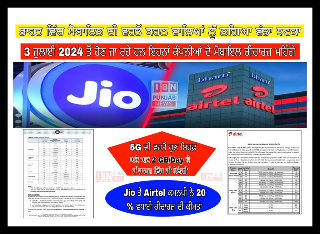 Jio ਤੇ Airtel ਕਮਨਪੀ ਨੇ 20 % ਵਧਾਈ ਰੀਚਾਰਜ਼ ਦੀ ਕੀਮਤਾਂ