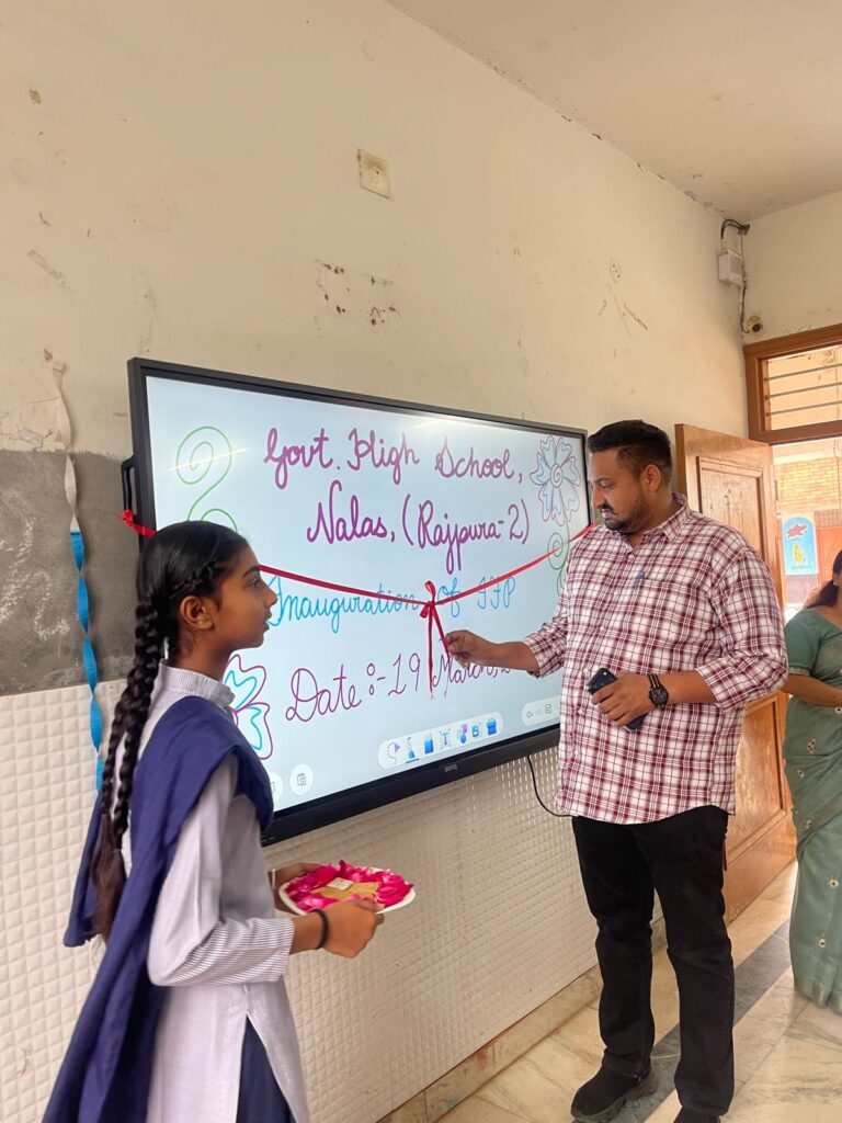Rajpura, March 19 (Himanshu Harry): As part of the education revolution being run by the Punjab government, a modern interactive panel was inaugurated today in Government High School Nalas. An atmosphere of joy and enthusiasm was seen among the school staff and students in this event. On this occasion, the honorable head mistress of the school, Mrs. Ritu Arora ji, and the honorable village sarpanch, Sardar Amandeep Singh Saini ji, Chairman SMC Harmesh Gir, former chairman Jaspal Chand, all SMC members and all panchayat members were specially present. The interactive panel was formally inaugurated by them. On this occasion, Head Mistress Mrs. Ritu Arora said in her address that the Punjab government is providing modern technology in government schools, which will give the students the opportunity to learn in a new and interesting way. She said that with the help of interactive panels, learning can be made even easier and more effective. On this occasion, Sarpanch Sardar Amandeep Singh Saini Ji also expressed his views and said that these new facilities coming in government schools will prove to be very useful for the children of the village and will play an important role in connecting them with modern education. The teachers also said that learning will become more interesting with videos, pictures and digital presentations through interactive panels. The students also expressed their happiness towards this new technology. Finally, the school staff thanked the Punjab Government and the Education Department, due to whose efforts the level of education in government schools is continuously increasing. On this occasion, they, along with Headmistress Ritu Arora and all the staff of Government High School Nalas, thanked the Punjab Government and the villagers.
