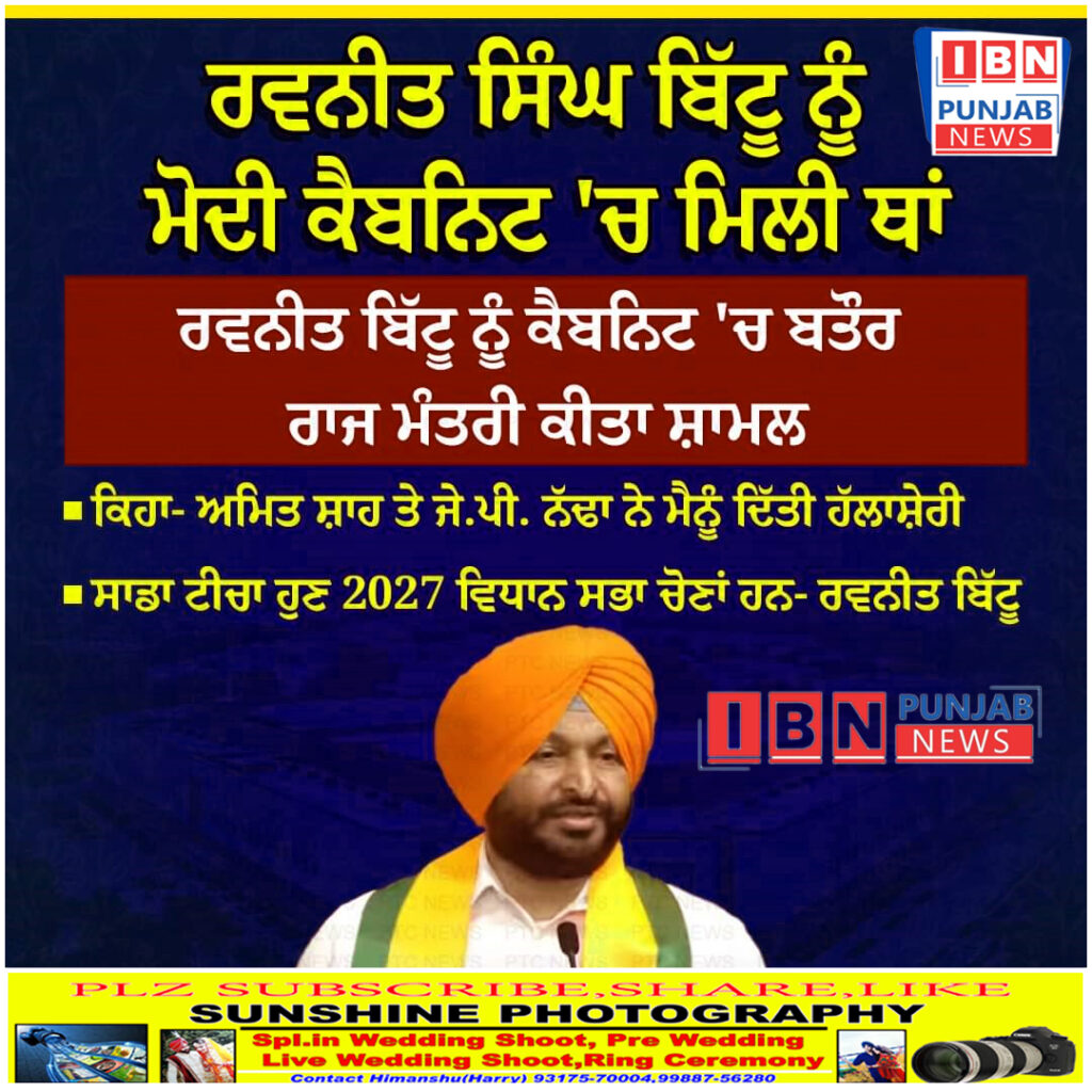 ਲੁਧਿਆਣਾ,10 ਜੂਨ: ਰਵਨੀਤ ਸਿੰਘ ਬਿੱਟੂ ਨੂੰ ਕੈਬੀਨਿਟ ‘ਚ ਬਤੌਰ ਰਾਜ ਮੰਤਰੀ ਕੀਤਾ ਗਿਆ ਸ਼ਾਮਲ ਕਿਹਾ- ਅਮਿਤ ਸ਼ਾਹ ਤੇ ਜੇ.ਪੀ ਨੱਡਾ ਨੇ ਮੈਨੂੰ ਦਿੱਤੀ ਹਲਾਸ਼ੇਰੀ ਸਾਡਾ ਟੀਚਾ ਹੁਣ 2027 ਵਿਧਾਨ ਸਭਾ ਚੋਣਾਂ ਹਨ – ਰਵਨੀਤ ਸਿੰਘ ਬਿੱਟੂ