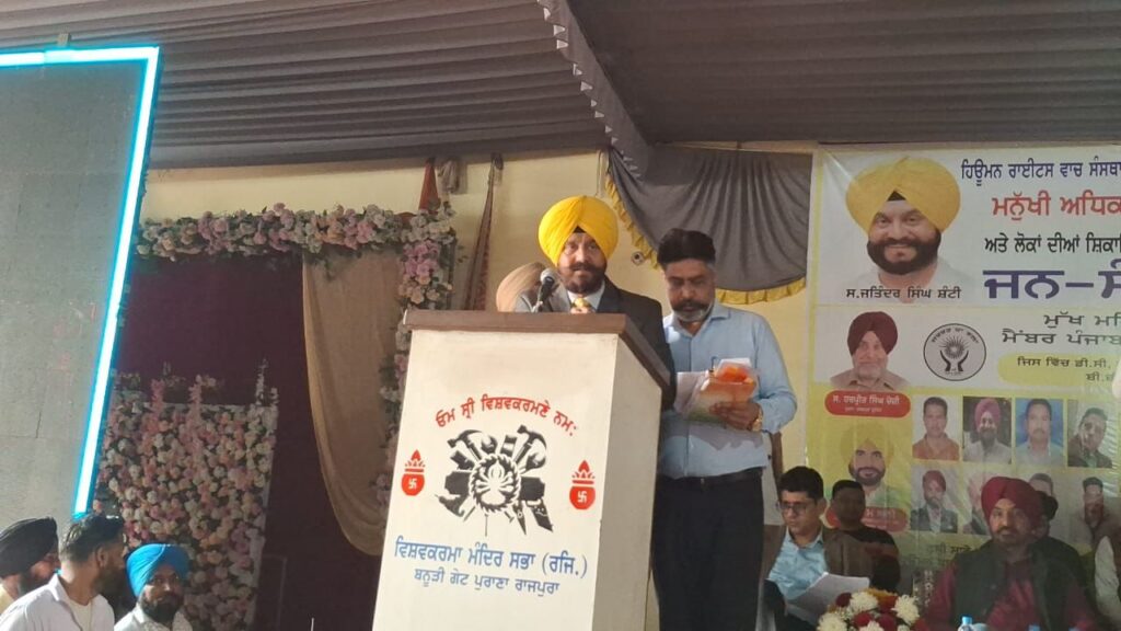 ਜਤਿੰਦਰ ਸਿੰਘ ਸ਼ੰਟੀ ਨੇ ਹਿਉਮਨ ਰਾਈਟਸ ਵਾਚ ਸੰਸਥਾ ਵੱਲੋਂ ਮਨੁੱਖੀ ਅਧਿਕਾਰ ਜਾਗਰੂਕਤਾ ਲਈ ਰਾਜਪੁਰਾ ‘ਚ ਕਰਵਾਏ ਜਨ ਸੰਮੇਲਨ ‘ਚ ਕੀਤੀ ਸ਼ਿਰਕਤ ਮਨੁੱਖੀ ਅਧਿਕਾਰ ਕਮਿਸਨ ਮੈਂਬਰ ਵੱਲੋਂ ਲੋਕਾਂ ਨੂੰ ਆਪਣੇ ਮਨੁੱਖੀ ਅਧਿਕਾਰਾਂ ਦੀ ਰਾਖੀ ਲਈ ਸੁਚੇਤ ਹੋਣ ਦਾ ਸੱਦਾ