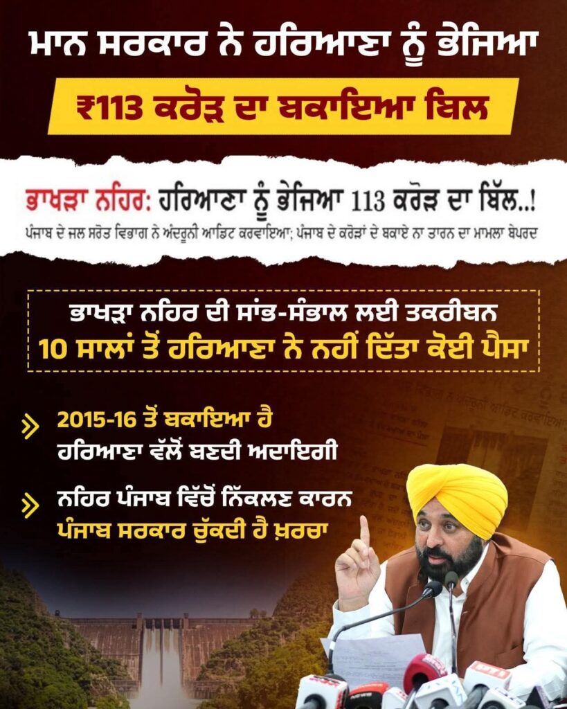 ਮਾਨ ਸਰਕਾਰ ਨੇ ਹਰਿਆਣਾ ਨੂੰ ਭੇਜਿਆ 113 ਕਰੋੜ ਦਾ ਬਕਾਇਆ ਬਿਲ, ਹਰਿਆਣਾ ਨੇ ਪਿਛਲੇ 10 ਸਾਲਾਂ ਤੋਂ ਨਹੀਂ ਦਿੱਤਾ ਭਾਖੜਾ ਨਹਿਰ ਦੀ ਸਾਂਭ-ਸੰਭਾਲ ਦਾ ਬਕਾਇਆ